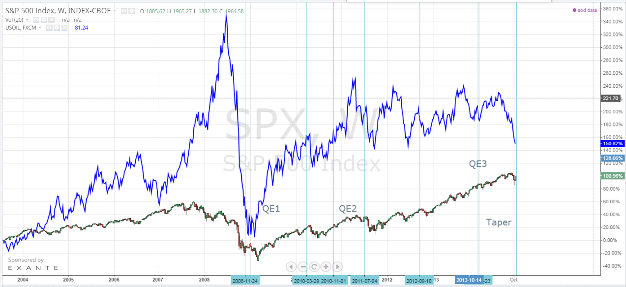En el gráfico anterior observamos los efectos de los llamados «QE» sobre la cotización del #SP500. Especial foco en la reacción del mercado una vez que han finalizado los estímulos.