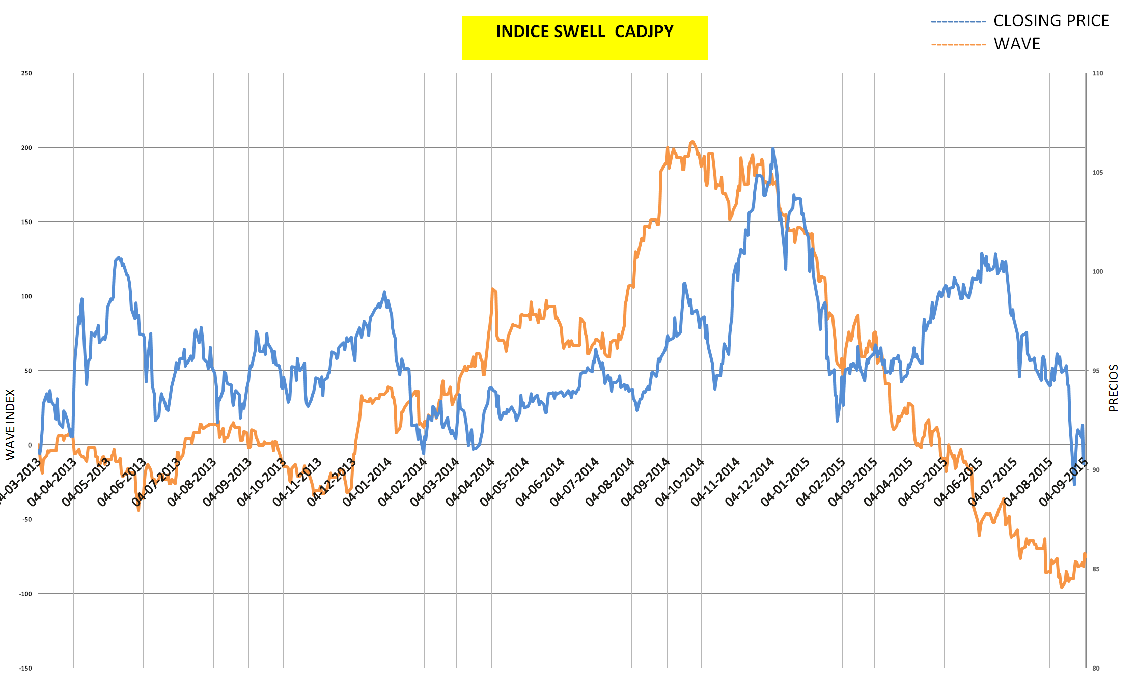 Nuestro Swell Index (índice fundamental) del CADJPY está sugiriendo desde hace algunas semanas una clara tendencia bajista. Los indicadores macro canadienses se han deteriorado en términos relativos más que los indicadores de Japón. Tal como se puede observar en la gráfica, existe un diferencial importante entre precio y fundamentos que muy probablemente sea cerrado en el corto plazo. El Swell Index parece mostrar la construcción de un piso, sin embargo, aun falta recorrido en el precio para cerrar el diferencial.