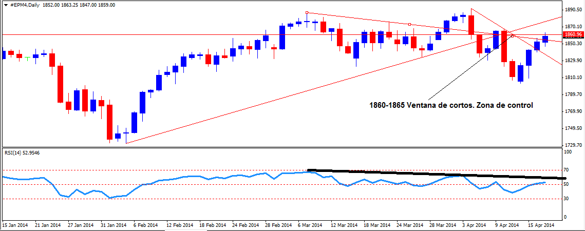 La primera resistencia importante en el area de los 1840-1845 fue quebrada al alza. Ahora el sp500 se enfrenta a la zona mas importante si quiere seguir manteniendo en el tono correctivo. Los 1860-1865 son una ventana para cortos. Un cierre semanal por arriba de los 1865 obligaría a cerrarlos y abrir largos. Por ahora el escenario bajista sigue vigente.